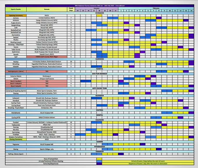 उत्तराखंड में 38वें राष्ट्रीय खेलों की तारीखों का ब्योरा जारी, देखें कहां होंगे कौन से गेम्स