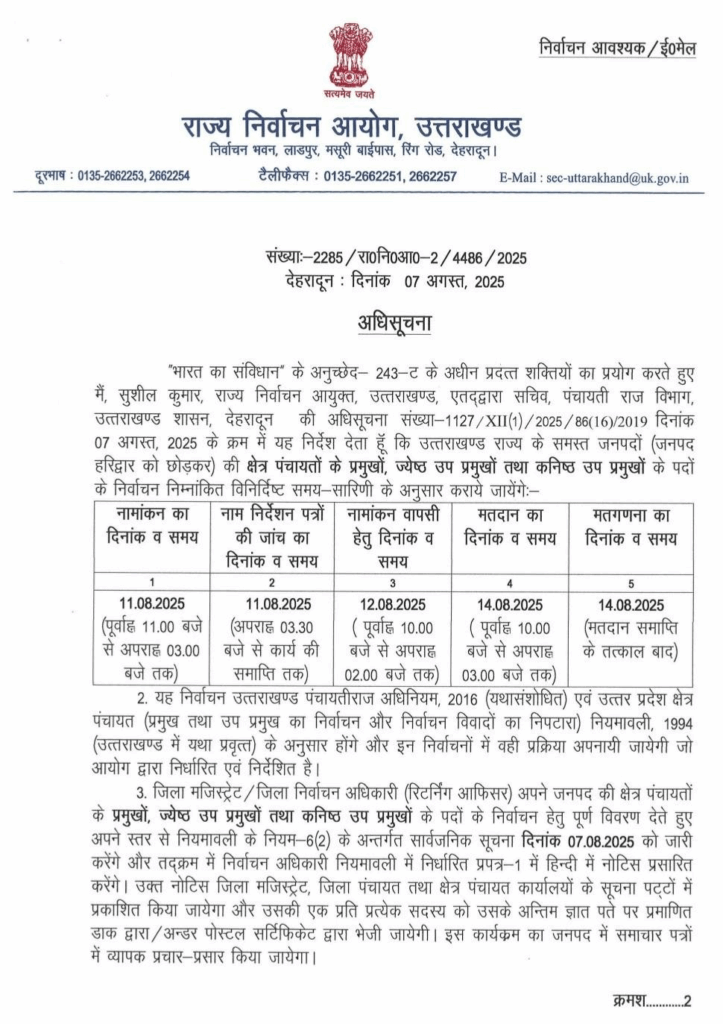 देहरादून।उत्तराखंड में निर्वाचन आयोग ने जिला पंचायत अध्यक्ष और ब्लॉक प्रमुख के चुनाव का नोटिफिकेशन जारी कर दिया है। इसके साथ ही 12 जिलों में आचार संहिता लागू हो गई है।